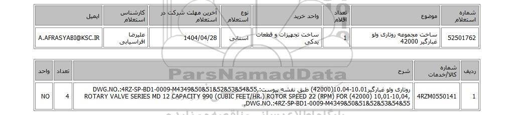| 52501762 | ساخت مجموعه روتاری ولو غبارگیر 42000 | 1 | ساخت تجهیزات و قطعات یدکی | استانی | 1404/04/28 | علیرضا افراسیابی | A.AFRASYABI@KSC.IR |