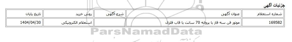 | 169582 | موتور فن سه فاز با پروانه 70 سانت با قاب فلزی | استعلام الکترونیکی | 1404/04/30 |