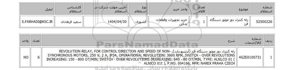 | 52500226 | رله کنترل دور موتور دستگاه فرز | 1 | خرید تجهیزات وقطعات یدکی | کشوری | 1404/04/30 | سعید فرهادی | S.FARHADI@KSC.IR |