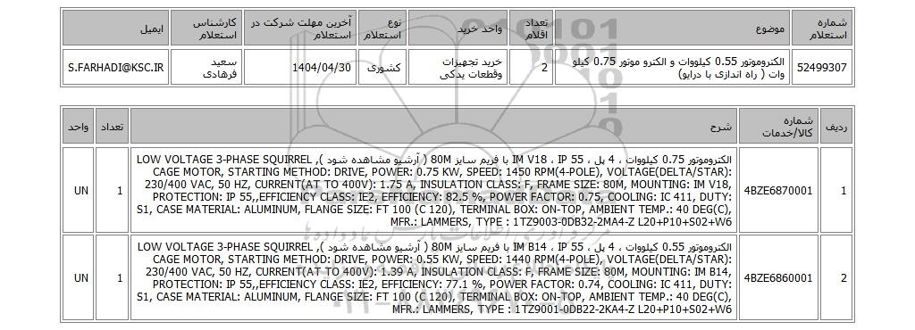 52499307الکتروموتور 0.55 کیلووات و الکترو موتور 0.75 کیلو وات ( راه اندازی با درایو)2خرید تجهیزات وقطعات یدکیکشوری1404/04/30سعید فرهادیS.FARHADI@KSC.IR