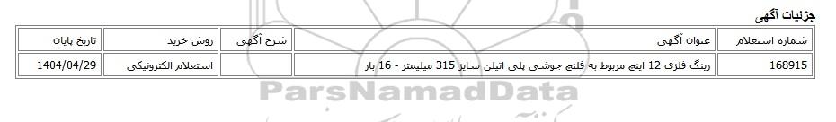 | 168915 | رینگ فلزی 12 اینچ مربوط به فلنچ جوشی پلی اتیلن سایز 315 میلیمتر - 16 بار | استعلام الکترونیکی | 1404/04/29 |