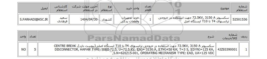52501536سکسیونر 72.5KV, 3150 A جهت استفاده در خروجی ترانسهای T4 تا T10 ایستگاه اصل1خرید تجهیزات وقطعات یدکیکشوری1404/04/30سعید فرهادیS.FARHADI@KSC.IR