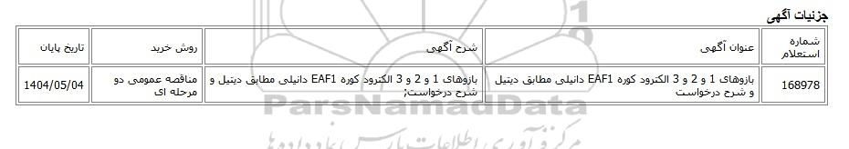 | 168978 | بازوهای 1 و 2 و 3 الکترود کوره EAF1 دانیلی مطابق دیتیل و شرح درخواست | بازوهای 1 و 2 و 3 الکترود کوره EAF1 دانیلی مطابق دیتیل و شرح درخواست; | مناقصه عمومی دو مرحله ای | 1404/05/04 |