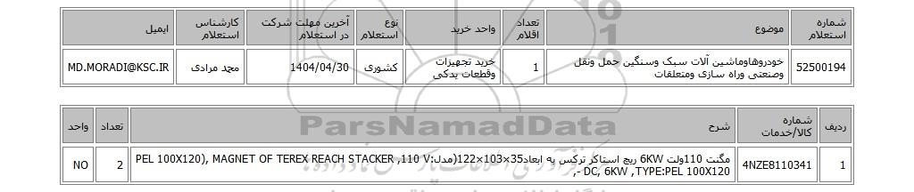 | 52500194 | خودروهاوماشین آلات سبک وسنگین حمل ونقل وصنعتی وراه سازی ومتعلقات | 1 | خرید تجهیزات وقطعات یدکی | کشوری | 1404/04/30 | محمد مرادی | MD.MORADI@KSC.IR |