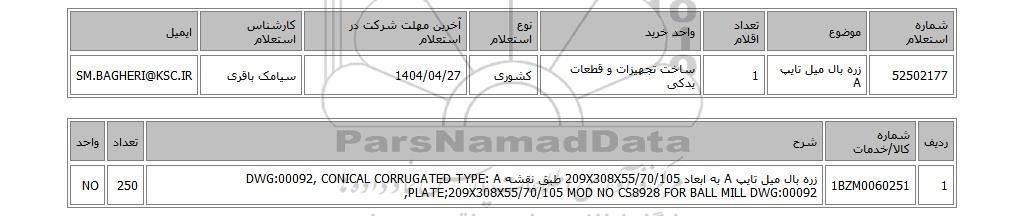 52502177زره بال میل تایپ A1ساخت تجهیزات و قطعات یدکیکشوری1404/04/27سیامک باقریSM.BAGHERI@KSC.IR