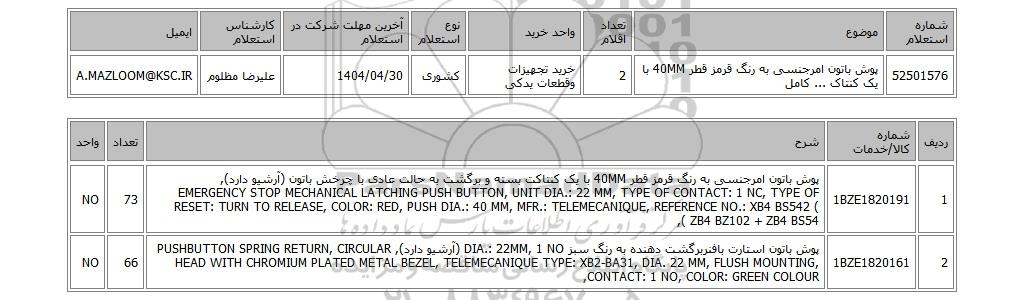 | 1 | 1BZE1820191 | پوش باتون امرجنسی به رنگ قرمز قطر 40MM با یک کنتاکت بسته و برگشت به حالت عادی با چرخش باتون (آرشیو دارد), EMERGENCY STOP MECHANICAL LATCHING PUSH BUTTON, UNIT DIA.: 22 MM, TYPE OF CONTACT: 1 NC, TYPE OF RESET: TURN TO RELEASE, COLOR: RED, PUSH DIA.: 40 MM, MFR.: TELEMECANIQUE, REFERENCE NO.: XB4 BS542 ( ZB4 BZ102 + ZB4 BS54 ), | 73 | NO |