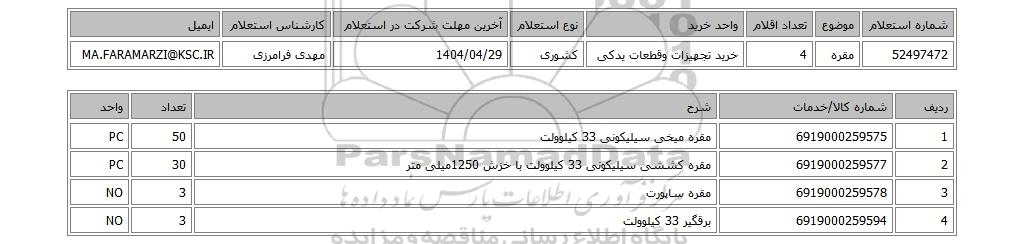 | 52497472 | مقره | 4 | خرید تجهیزات وقطعات یدکی | کشوری | 1404/04/29 | مهدی فرامرزی | MA.FARAMARZI@KSC.IR |