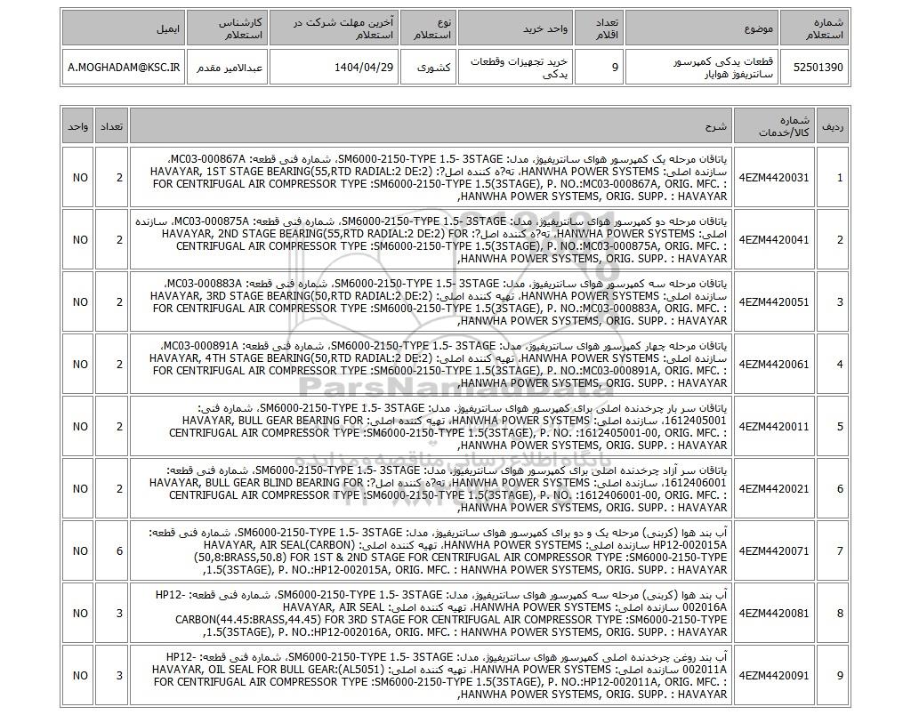 | 52501390 | قطعات یدکی کمپرسور سانتریفوژ هوایار | 9 | خرید تجهیزات وقطعات یدکی | کشوری | 1404/04/29 | عبدالامیر مقدم | A.MOGHADAM@KSC.IR |