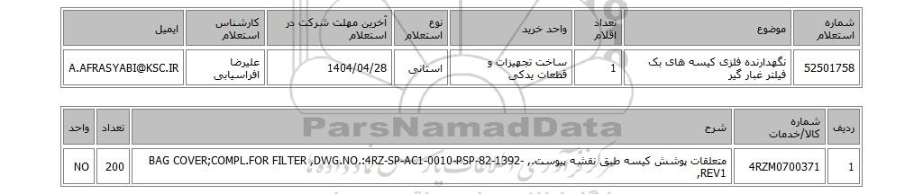 | 52501758 | نگهدارنده فلزی کیسه های بک فیلتر غبار گیر | 1 | ساخت تجهیزات و قطعات یدکی | استانی | 1404/04/28 | علیرضا افراسیابی | A.AFRASYABI@KSC.IR |