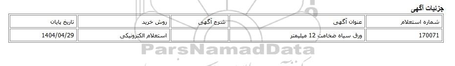 | 170071 | ورق سیاه ضخامت 12 میلیمتر | استعلام الکترونیکی | 1404/04/29 |