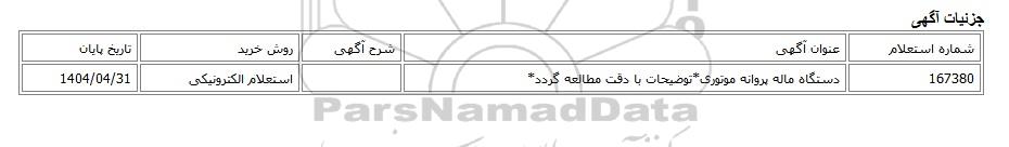 | 167380 | دستگاه ماله پروانه موتوری*توضیحات با دقت مطالعه گردد* | استعلام الکترونیکی | 1404/04/31 |