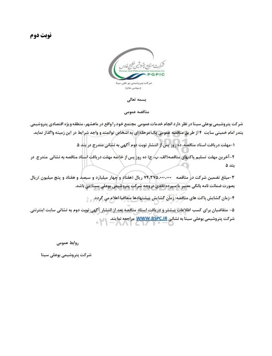 5- متقاضیان برای کسب اطلاعات بیشتر و دریافت اسناد مناقصه بعد از انتشار آگهی نوبت دوم به نشانی سایت اینترنتی شرکت پتروشیمی بوعلی سینا به نشانی WWW.BSPC.IR مراجعه نمایند.