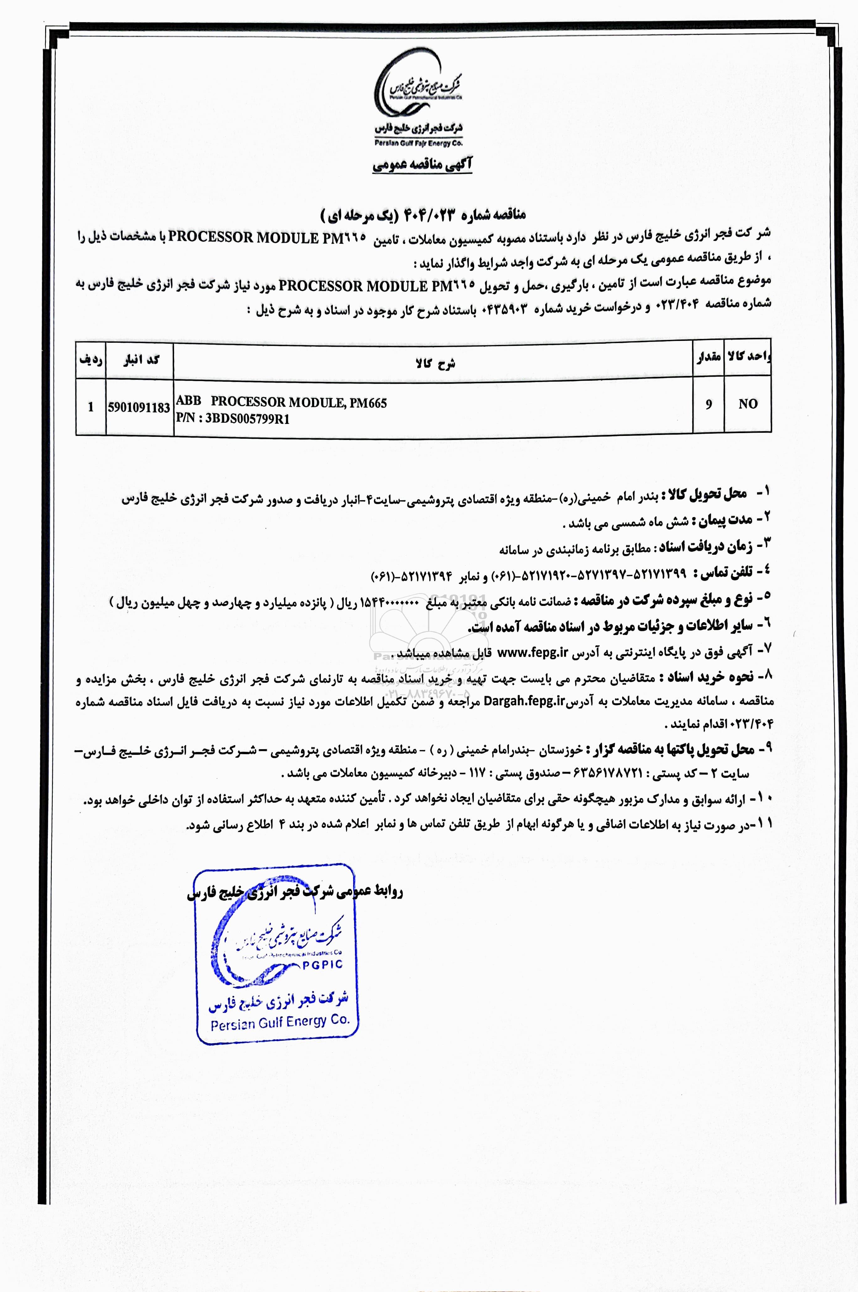 شرکت فجر انرژی خلیج فارس در نظر دارد باستناد مصوبه کمیسیون معاملات ، تامین PROCESSOR MODULE PM665 با مشخصات ذیل را از طریق مناقصه عمومی یک مرحله ای به شرکت واجد شرایط واگذار نماید: