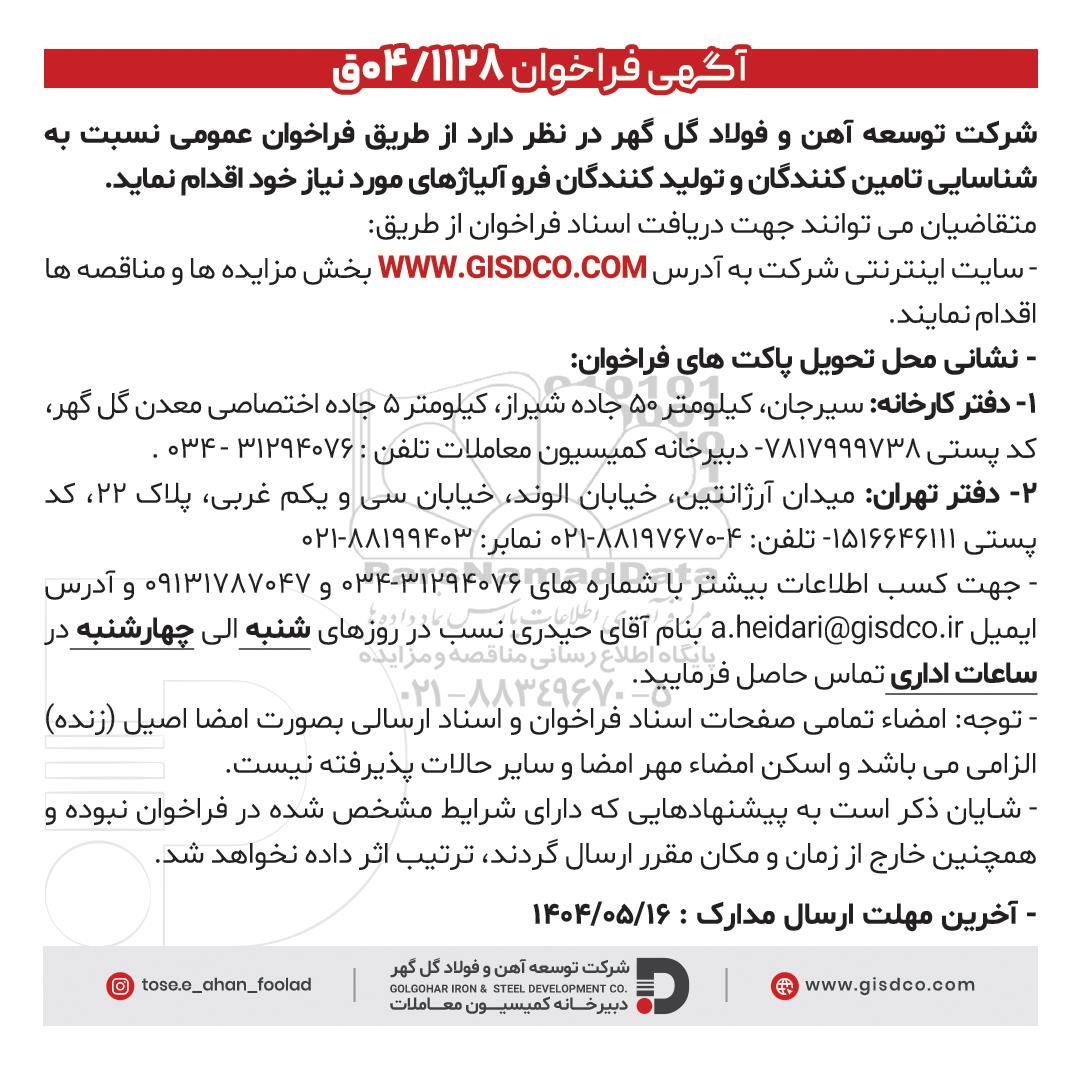 شرکت توسعه آهن و فولاد گل گهر در نظر دارد از طریق فراخوان عمومی نسبت به شناسایی تامین کنندگان و تولید کنندگان فرو آلیاژهای مورد نیاز خود اقدام نماید.