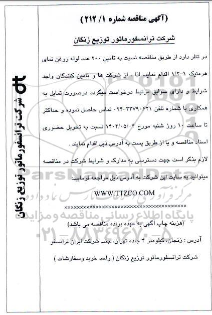 در نظر دارد از طریق مناقصه نسبت به تامین 200 عدد لوله روغن نمای هرمتیک 1 - 1/2 اقدام نماید. لذا از شرکت ها و تامین کنندگان واجد شرایط و دارای سوابق مرتبط درخواست می گردد در صورت تمایل به همکاری با شماره تلفن 33790621 - 024 تماس حاصل نموده و حداکثر تا ساعت 10 روز شنبه مورخ 1404.05.04 نسبت به تحویل حضوری اسناد مناقصه و یا از طریق پست به آدرس ذیل اقدام نمایند.