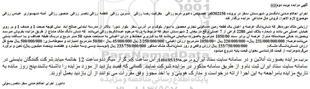 اجرای احکام مدنی دادگستری شهرستان سقز در پرونده 0302156در خصوص دعوی مریم رزاقی بطرفیت رضا رزاقی نسرین رزاقی فاطمه رزاقی ناصر رزاقی منصور رزاقی آمنه شهسواری عباس رزاقی موضوع لازم الاجرا: فروش مال مشاعی مزایده برگذار کند