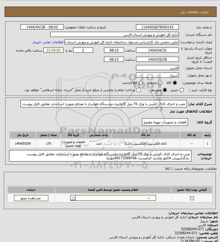 شرح کلی نیاز: نصب و اجرای کانال کشی با ورق 70 میل گالوانیزه دودستگاه هواساز با مصالح بصورت استاندارد مطابق فایل پیوست