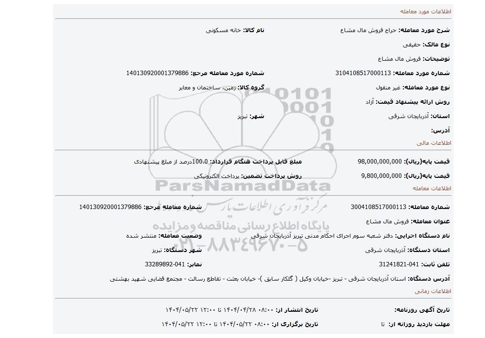 | شرح مورد معامله: حراج فروش مال مشاع | نام کالا: خانه مسکونی | |