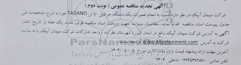 شرکت سیمان آبیک در نظر دارد نسبت به انجام تعمیرات یک دستگاه جرثقیل 50 تن TADANO خود به شرح مشخصات فنی جدول پیوست اسناد مناقصه اقدام نماید. متقاضیان می توانند جهت دریافت اسناد مناقصه ظرف مدت یک هفته از تاریخ انتشار آگهی به آدرس شرکت سیمان آبیک واقع در استان البرز ، شهرستان نظرآباد ، واحد تدارکات شرکت سیمان آبیک یا به سایت شرکت به آدرس www.Abyekcement.com مراجعه نمایند.