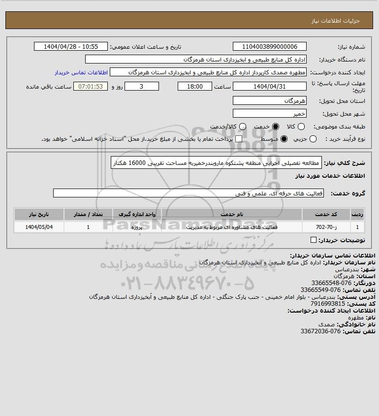 شرح کلی نیاز: مطالعه تفصیلی اجرایی منطقه پشتکوه ماروبندرخمیربه مساحت تقریبی 16000 هکتار