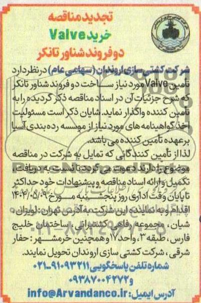 تجدید مناقصه خرید Valve دو فروند شناور تانکر