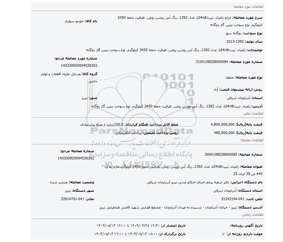 عنوان معامله: زامیاد. تیپ:z24nib. مدل 1392. رنگ آبی روشن روغن. ظرفیت جمعا 3450 کیلوگرشماره پلاک: 445 ص 39 ایران 25