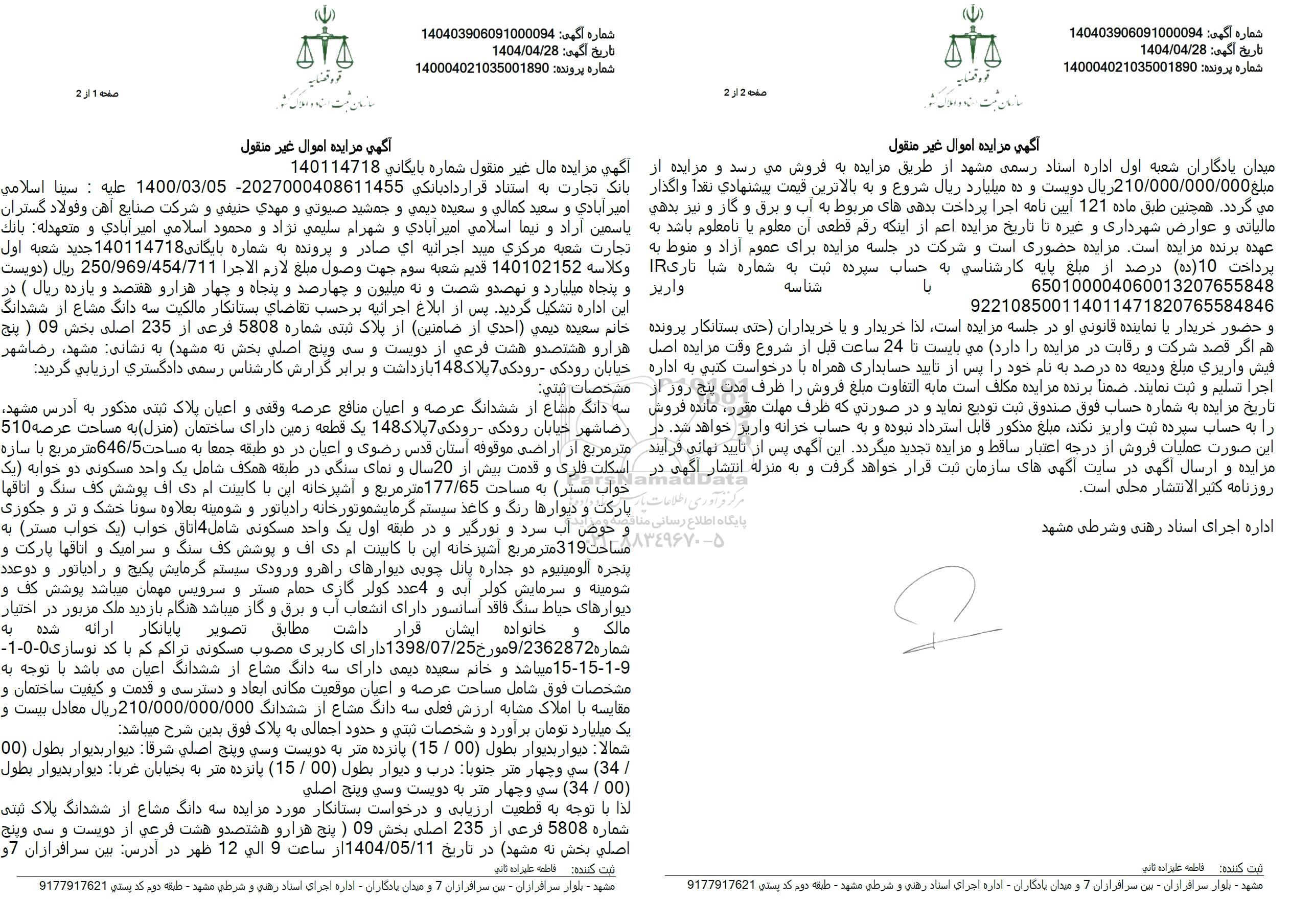 تاریخ مزایده 1404.05.11 ساعت 9 الی 12