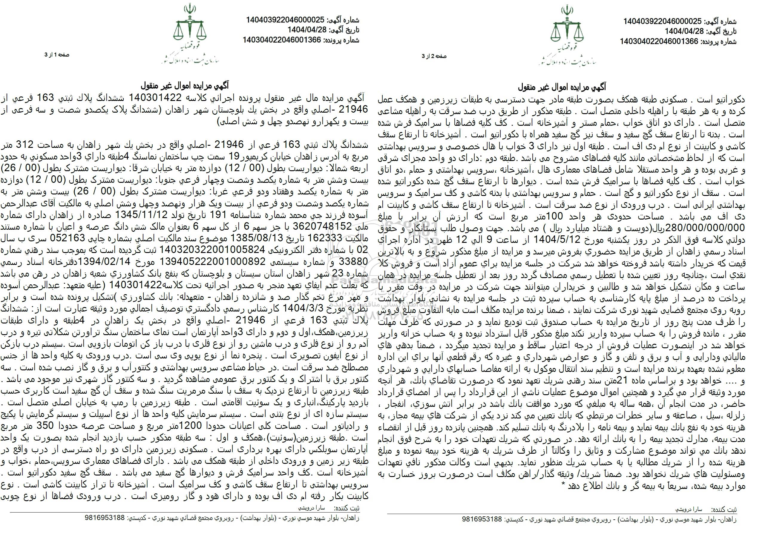 مزایده فروش ملک با مساحت 312 مترمربع با پلاک ثبتی 163 فرعی از 21946 اصلی