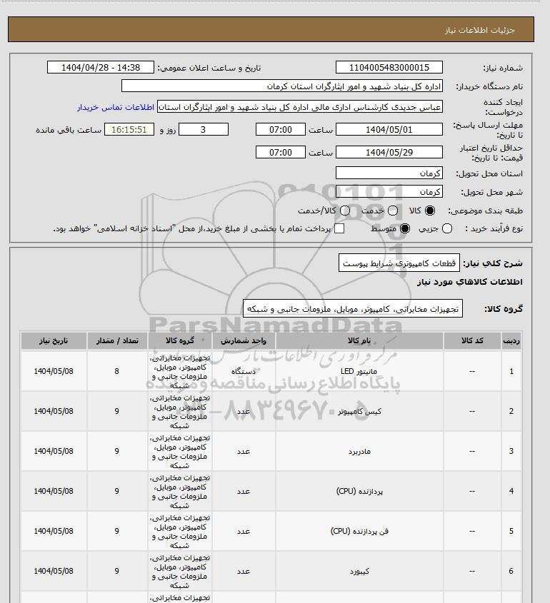 نام دستگاه خریدار:اداره کل بنیاد شهید و امور ایثارگران استان کرمان