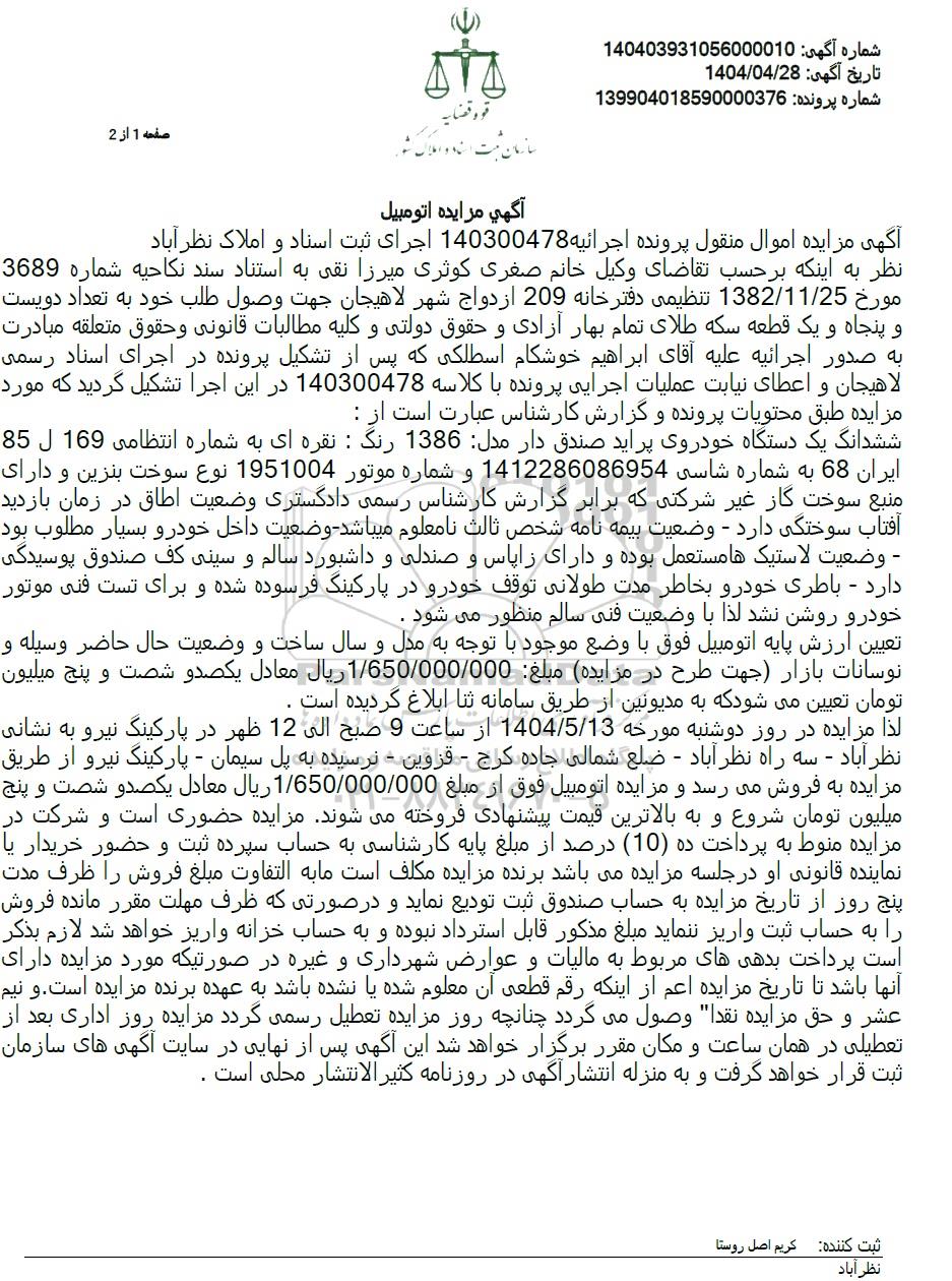 مزایده فروش یک دستگاه خودروی سواری پراید صندوق دار مدل 86