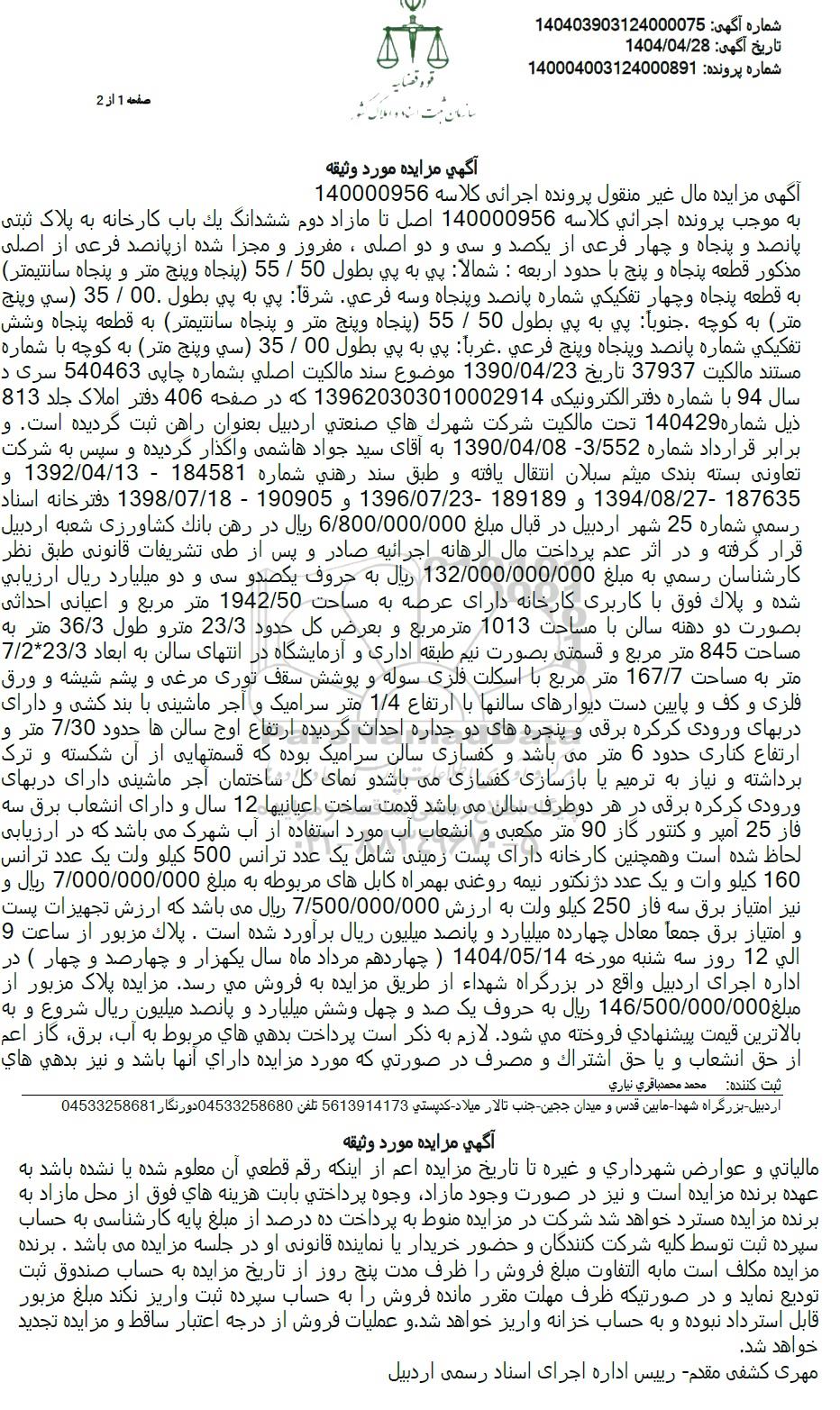 مزایده فروش ششدانگ یک باب کارخانه به پلاک ثبتی پانصد و پنجاه و چهار فرعی از یکصد و سی و دو اصلی، مفروز و مجزا شده از پانصد فرعی از اصلی مذکور قطعه پنجاه و پنج ، کاربری کارخانه ای دارای عرصه به مساحت 1942/50 متر مربع و اعیانی احداثی بصورت دو دهنه سالن با مساحت 1013 متر مربع و بعرض کل حدود 23/3 متر