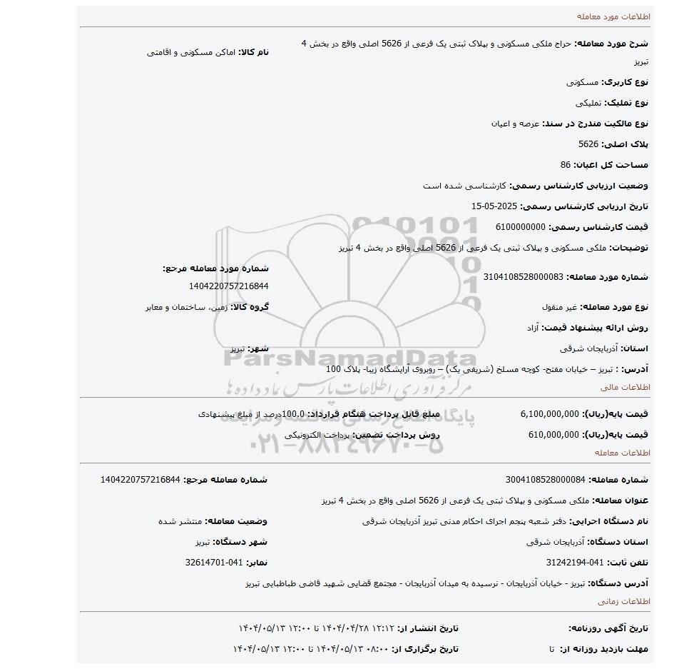 | شرح مورد معامله: حراج ملکی مسکونی و بپلاک ثبتی یک فرعی از 5626 اصلی واقع در بخش 4 تبریز | نام کالا: اماکن مسکونی و اقامتی | |