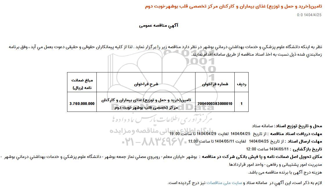 | 1 | 2004000383000010 | تامین (خرید و حمل و توزیع) غذای بیماران و کارکنان مرکز تخصصی قلب بوشهر- نوبت دوم | 3.760.000.000 |