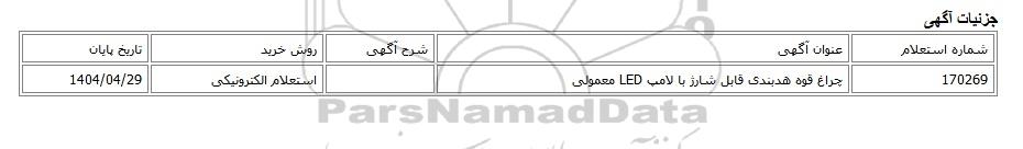 | 170269 | چراغ قوه هدبندی قابل شارژ با لامپ LED معمولی | استعلام الکترونیکی | 1404/04/29 |