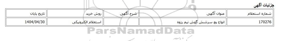 | 170276 | انواع پچ سرشش گوش نیم رزوه | استعلام الکترونیکی | 1404/04/30 |