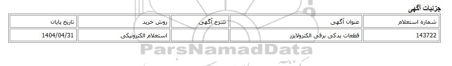 143722قطعات یدکی برقی الکترولایزراستعلام الکترونیکی1404/04/31