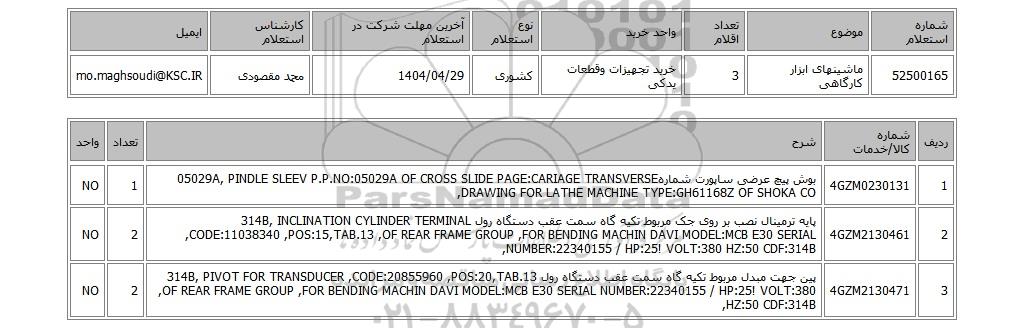 | 52500165 | ماشینهای ابزار کارگاهی | 3 | خرید تجهیزات وقطعات یدکی | کشوری | 1404/04/29 | محمد مقصودی | mo.maghsoudi@KSC.IR |