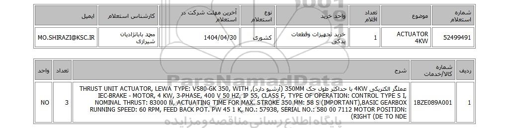 | 52499491 | ACTUATOR 4KW | 1 | خرید تجهیزات وقطعات یدکی | کشوری | 1404/04/30 | محمد بابانژادیان شیرازی | MO.SHIRAZI@KSC.IR |