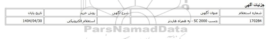 | 170284 | چسب SC 2000 - به همراه هاردنر | استعلام الکترونیکی | 1404/04/30 |