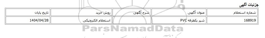 | 168919 | شیر یکطرفه PVC | استعلام الکترونیکی | 1404/04/28 |