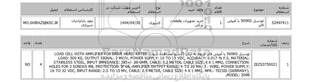 | 52497411 | لودسل 500KG با آمپلی فایر | 1 | خرید تجهیزات وقطعات یدکی | کشوری | 1404/04/30 | محمد بابانژادیان شیرازی | MO.SHIRAZI@KSC.IR |