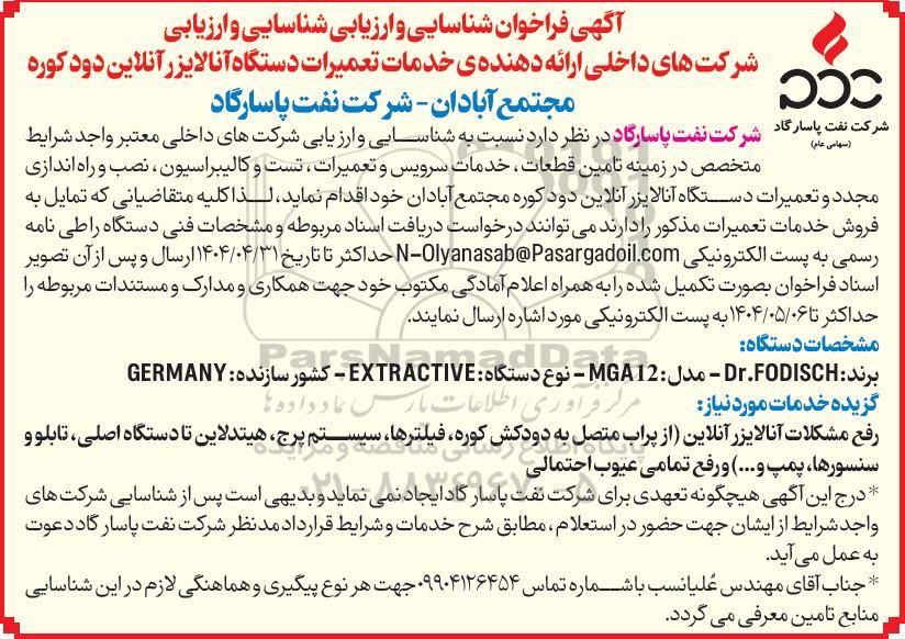 شرکت نفت پاسارگاد در نظر دارد نسبت به شناسایی و ارزیابی شرکت های داخلی معتبر واجد شرایط متخصص در زمینه تامین قطعات، خدمات سرویس و تعمیرات، تست و کالیبراسیون، نصب و راه اندازی مجدد و تعمیرات دستگاه آنالایزر آنلاین دود کوره مجتمع آبادان خود اقدام نماید، لذا کلیه متقاضیانی که تمایل به فروش خدمات تعمیرات مذکور را دارند می توانند درخواست دریافت اسناد مربوطه و مشخصات فنی دستگاه را طی نامه رسمی به پست الکترونیکی N-Olyanasab@Pasargadoil.com حداکثر تا تاریخ 1404.04.31 ارسال و پس از آن تصویر اسناد فراخوان بصورت تکمیل شده را به همراه اعلام آمادگی مکتوب خود جهت همکاری و مدارک و مستندات مربوطه را حداکثر تا 1404.05.06 به پست الکترونیکی مورد اشاره ارسال نمایند.
