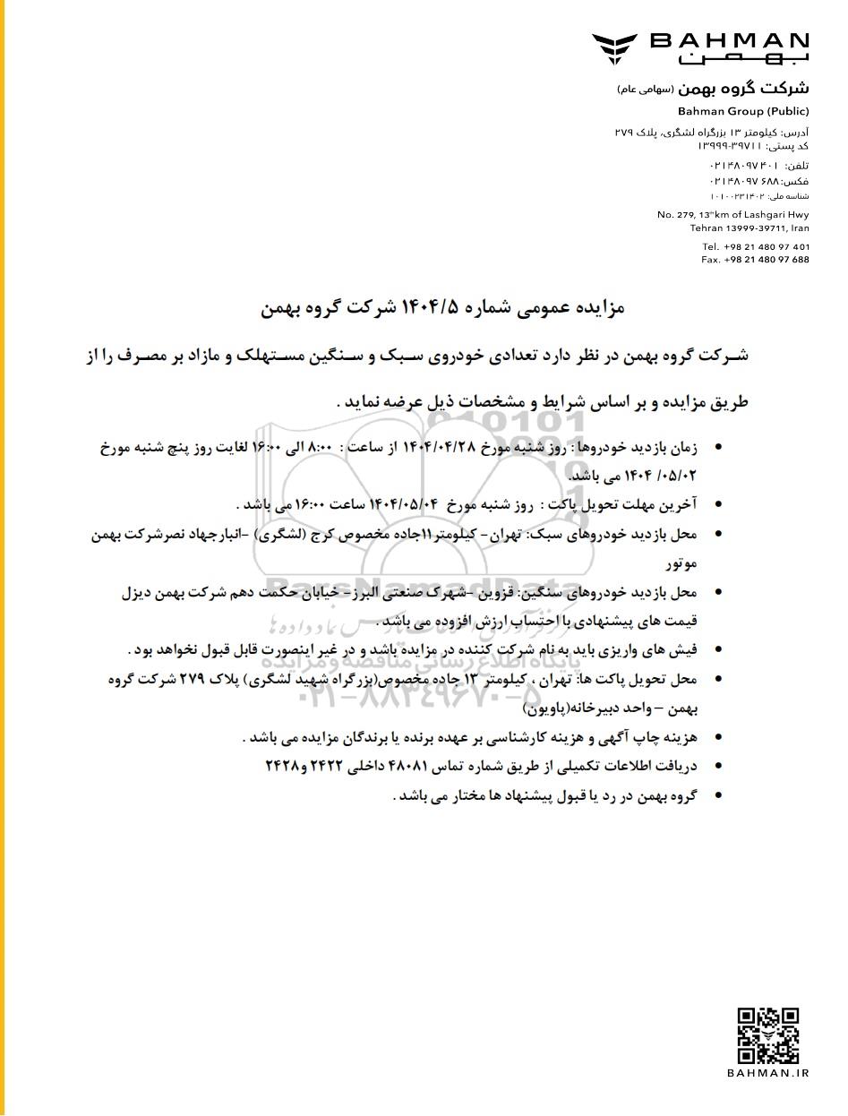 مزایده عمومی شماره 1404/5 شرکت گروه بهمن