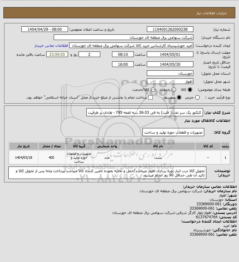 توضیحات خریدار:تحویل کالا درب انبار بهره برداری اهواز میباشد/حمل و تخلیه بعهده تامین کننده کالا میباشد/پرداخت وجه پس از تحویل کالا و تائید آن طی حداقل 90 روز انجام میشود