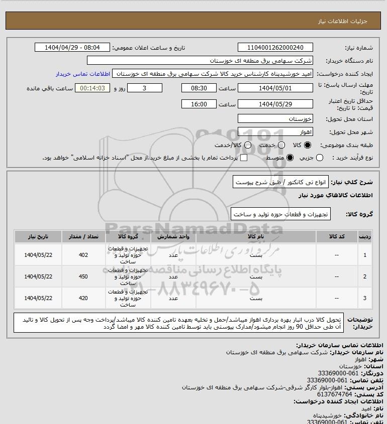 نام دستگاه خریدار:شرکت سهامی برق منطقه ای خوزستان