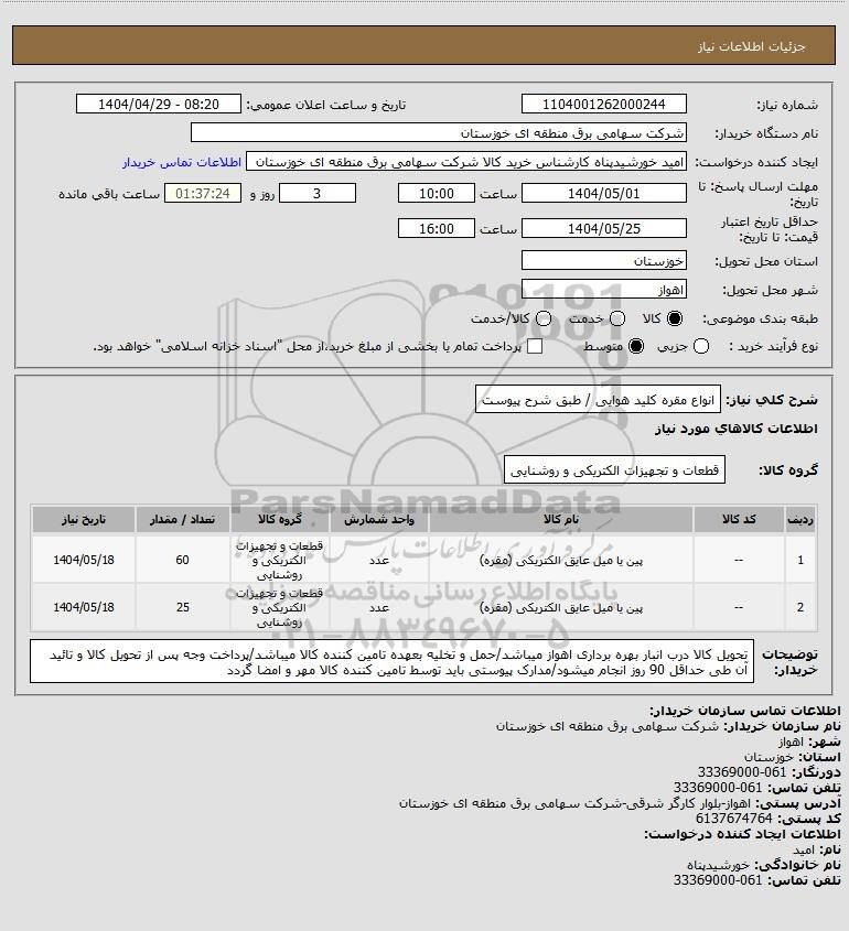 شرح کلی نیاز: انواع مقره کلید هوایی / طبق شرح پیوست