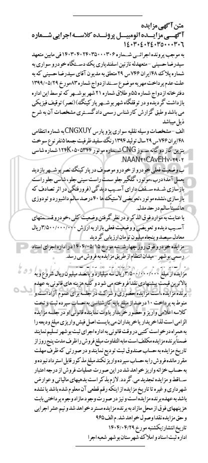 مزایده: یک دستگاه خودرو سواری پژو پارس CNGXUY رنگ سفید دوگانه سوز مدل 1394