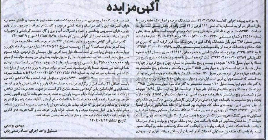 مزایده ششدانگ عرصه و اعیان یک قطعه زمین پلاک ثبتی 111 فرعی از 14 اصلی کلاسه 140302878