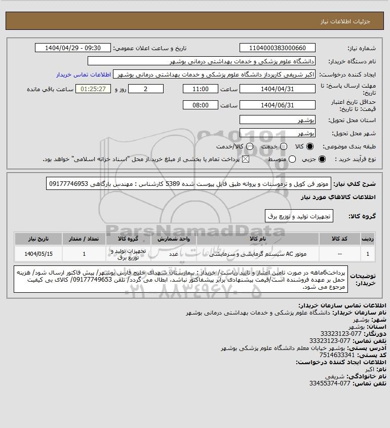 شرح کلی نیاز: موتور فن کویل و ترموستات و پروانه طبق فایل پیوست شده 5389