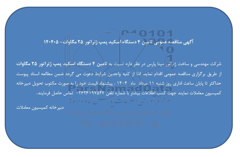 علاقهمندان میتوانند جهت دریافت اسناد و اطلاعات تکمیلی، مناقصه عمومی تامین 4 دستگاه اسکید پمپ ژنراتور 25 مگاوات با سامانه مناقصات و مزایدات ایران پارسنماد داده ها 88349670 تماس حاصل نمایند.